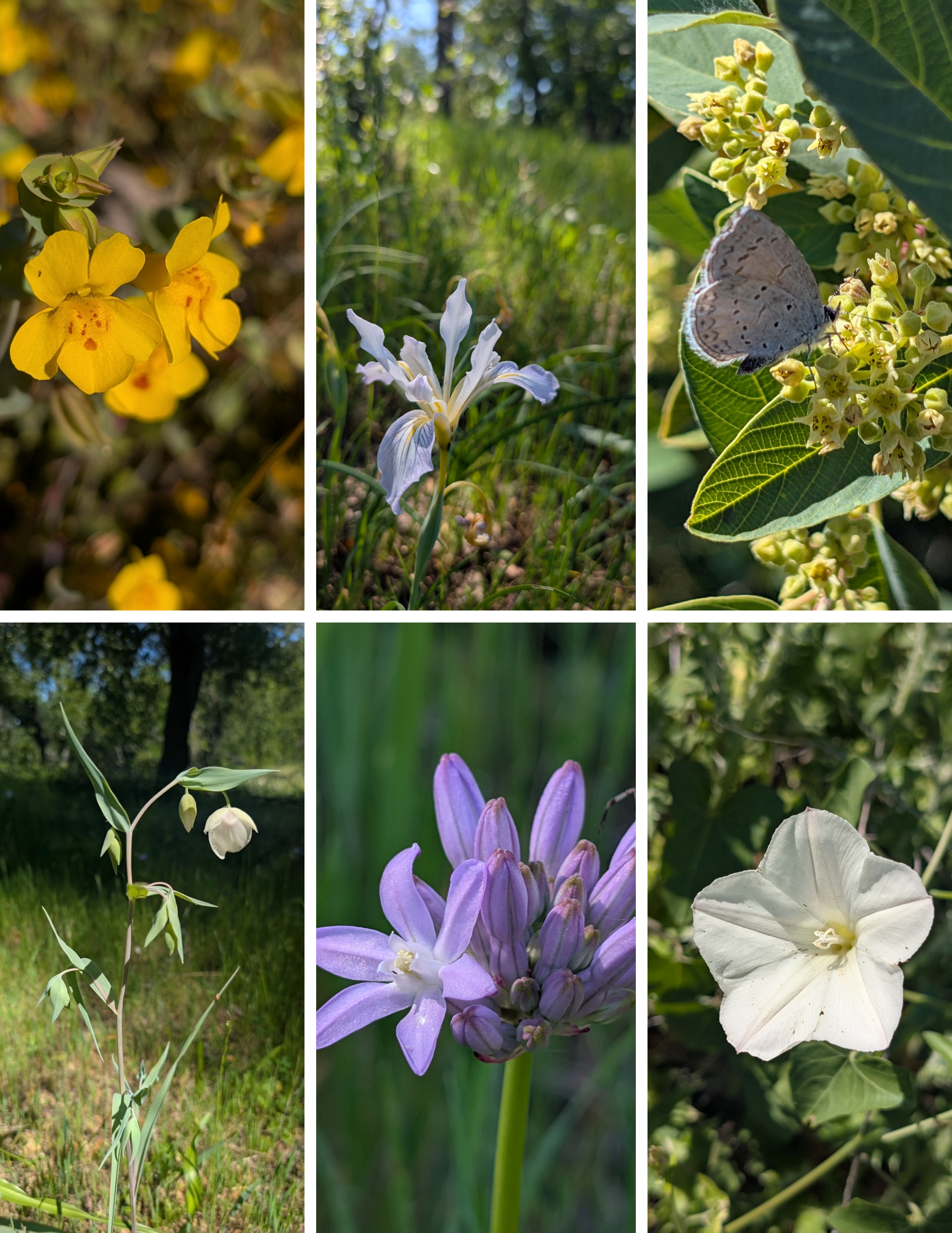 Top (left to right): Shield-bracted monkeyflower, bowtube iris, echo azure butterfly on California coffeeberry