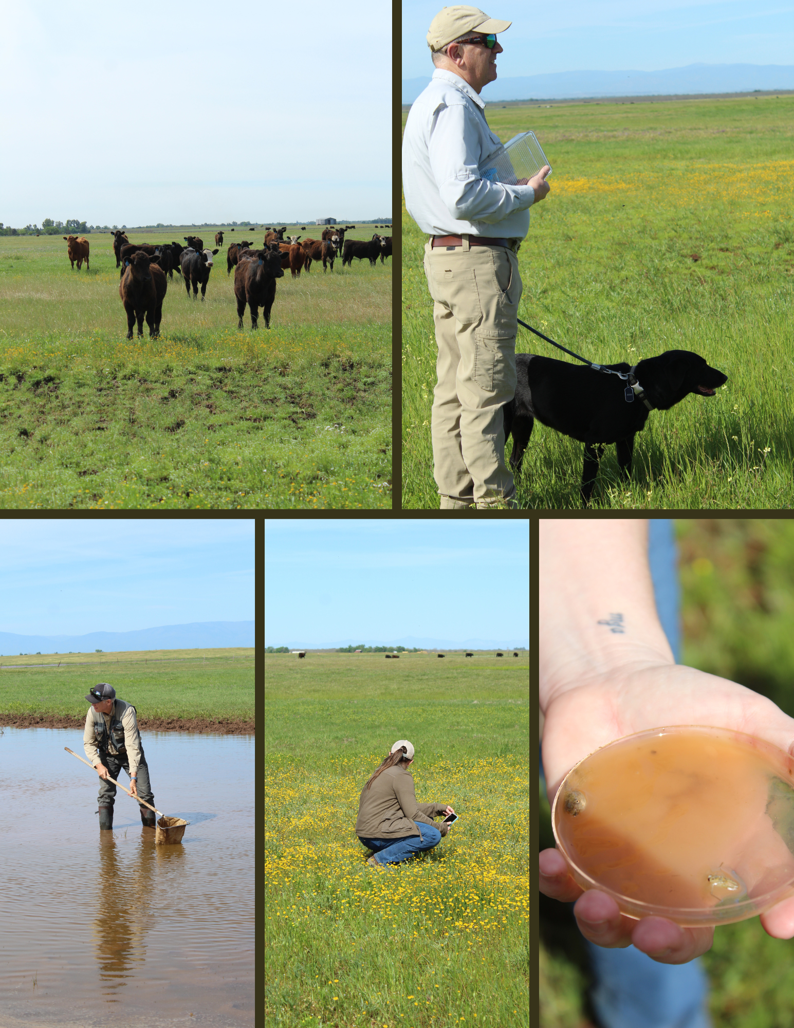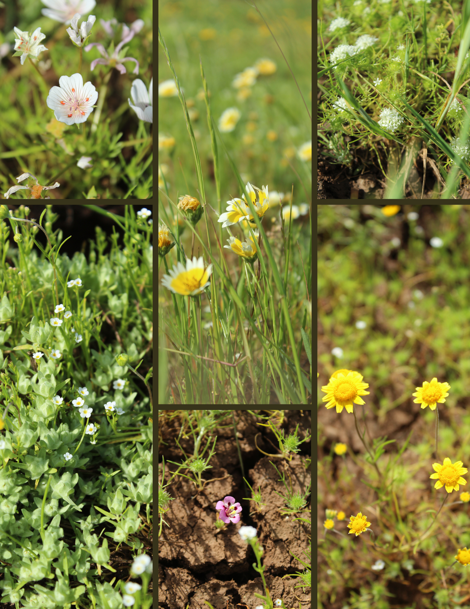 A variety of flowers often found in or around vernal pools! This collage includes tidy tips, meadowfoam, goldfields, tricolor monkeyflower, and more!